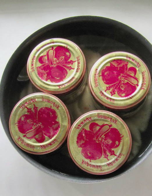 - Bedek de potten met deksels en steriliseer ze 15-20 minuten in kokend water.
