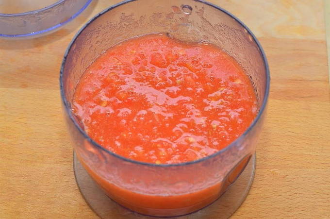 We wassen de tomaten. We vegen ze af met een keukenhanddoek. We snijden elke tomaat in de lengte in twee helften (we nemen slechts een deel van het fruit). Daarna doen we ze in een blender en hakken ze in puree. Dit kan met een vleesmolen of sapcentrifuge.