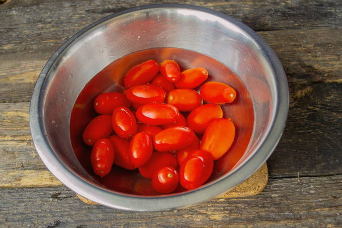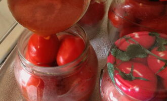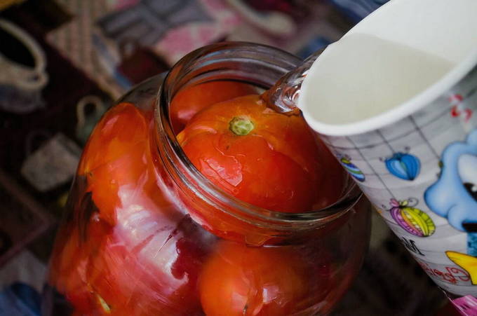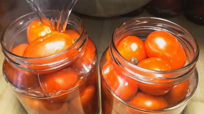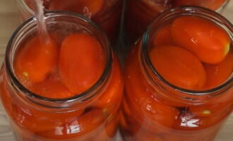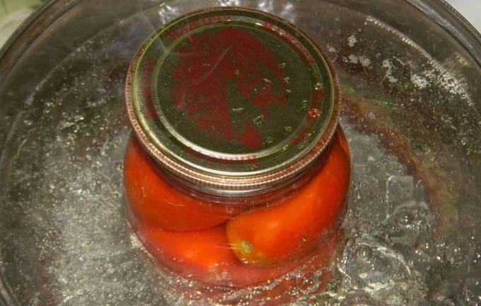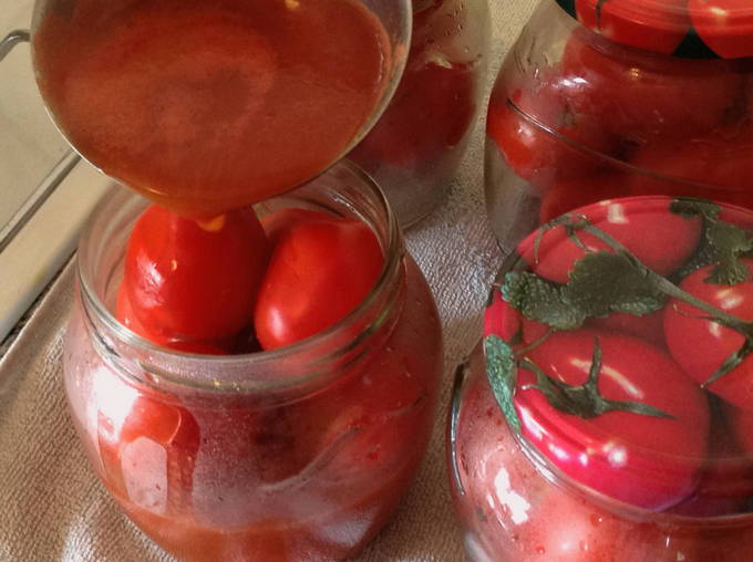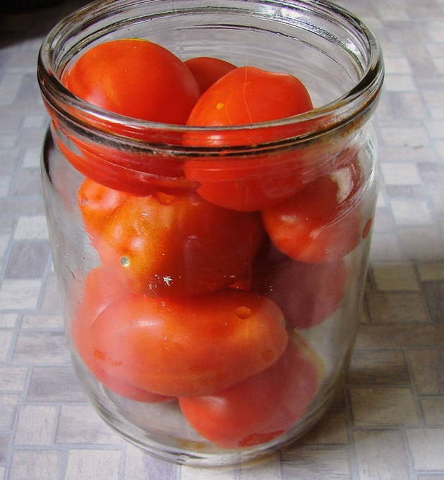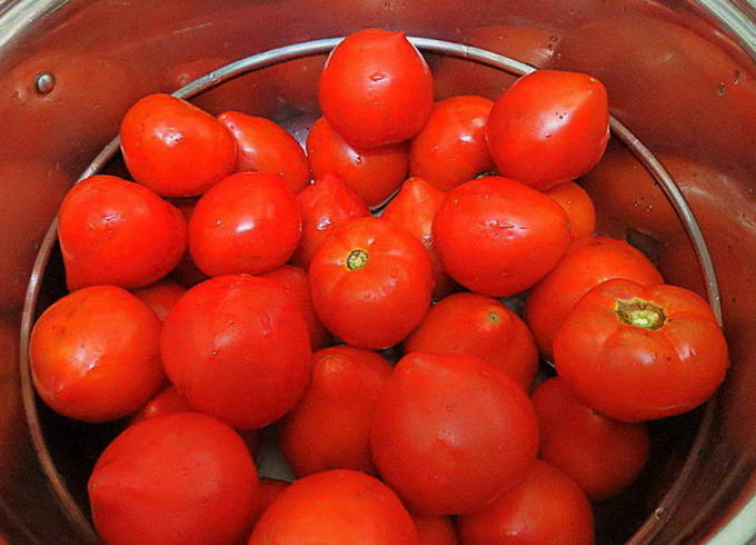 - We verwijderen pure tomaten van de stengels. We doen ze in gesteriliseerde potten. We zetten het stevig vast. We zetten een pan water op het fornuis. Breng het aan de kook. Giet kokend water over de tomaten, dek de potten af met deksels of een handdoek en laat 20 minuten staan.