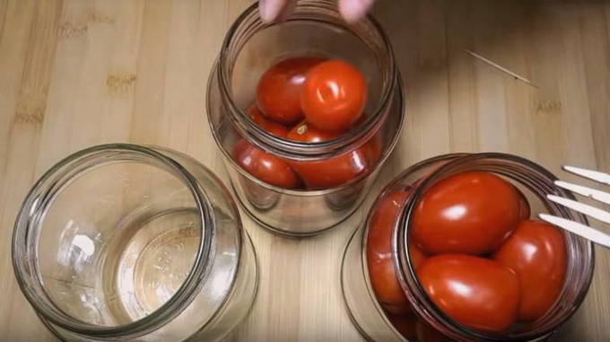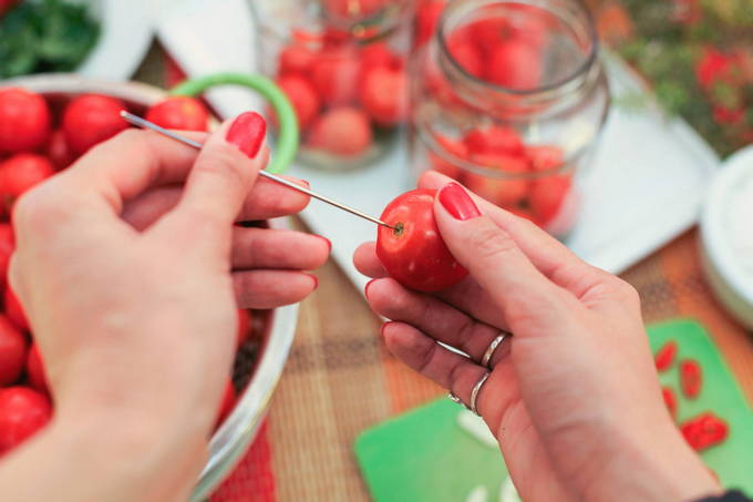 - We reinigen blikken en deksels voor toekomstige naden met zuiveringszout. We wassen ze goed en steriliseren op elke handige manier. We wassen alle tomaten. We vegen ze af en kiezen degene die in potten worden gestapeld. We prikken ze op verschillende plaatsen met een tandenstoker of een naald. Ze zullen dus niet barsten als we kokend water in de potten gieten.