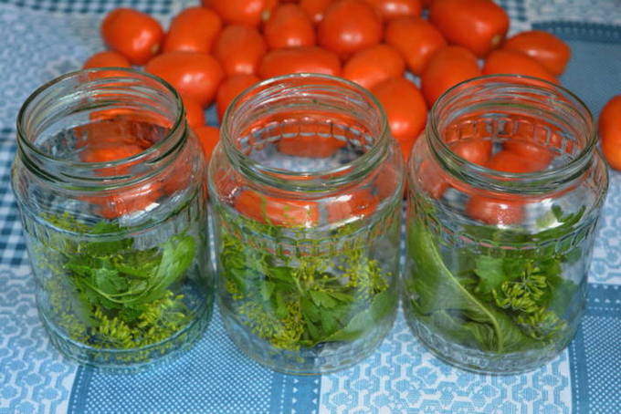 - We wassen de greens met stromend water. We verspreiden het op een papieren handdoek om het te drogen. We sturen peterselie naar de bodem van de pot en leggen de tomaten erop.