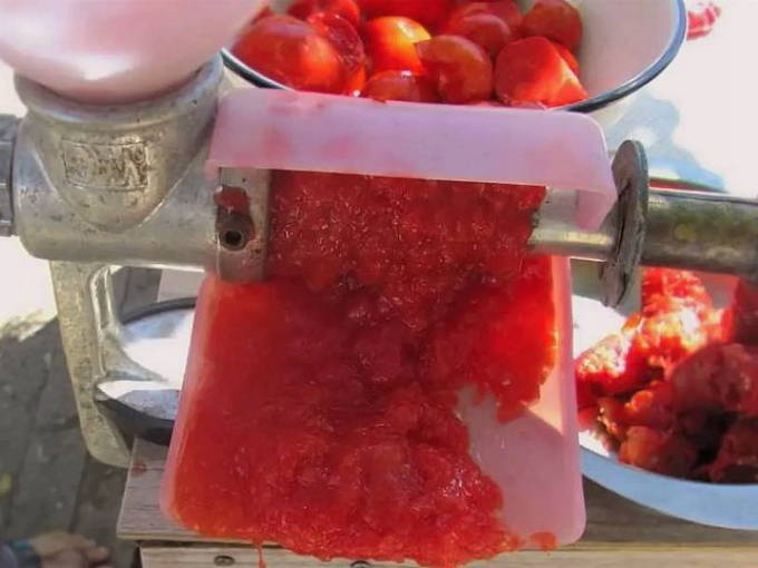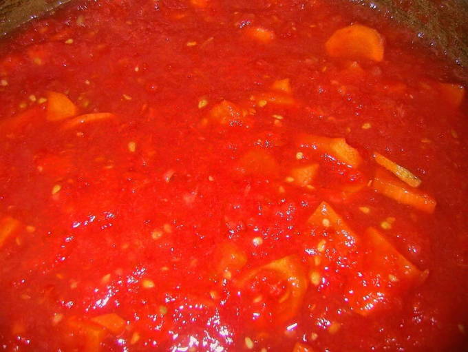 - Snijd de tomaten (3 kg) in twee delen om te schenken. We doen ze in een sapcentrifuge en malen ze. Pel de knoflookteentjes en voeg ze toe aan de tomatenpuree. Dan sturen we peper, suiker en zout. Meng het mengsel grondig.