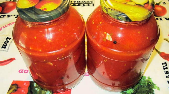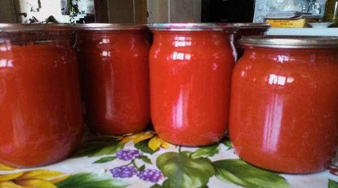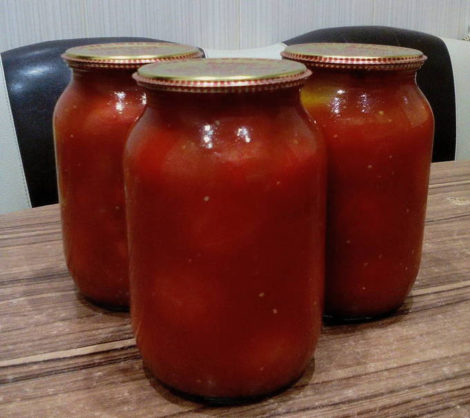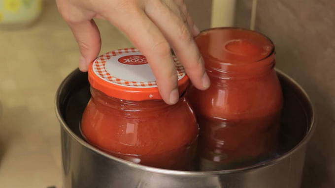 - Verwijder na de toegestane tijd de deksels of een handdoek, laat het water uit de blikken in de gootsteen lopen en voeg aan elk blikje dezelfde hoeveelheid azijn toe. Vul de tomaten met hete tomatenpuree tot de bovenkant van de potten. Rol de deksels op en draai ze ondersteboven. We verpakken de potten, laten ze afkoelen. Na 2-3 dagen brengen we het over naar opslag in de voorraadkast.