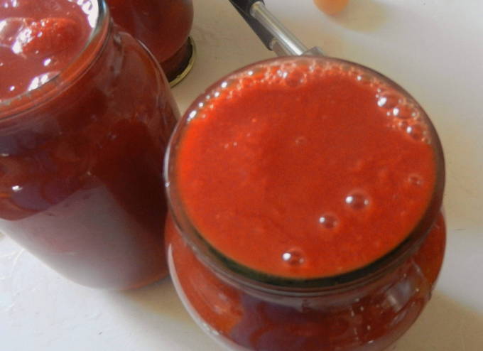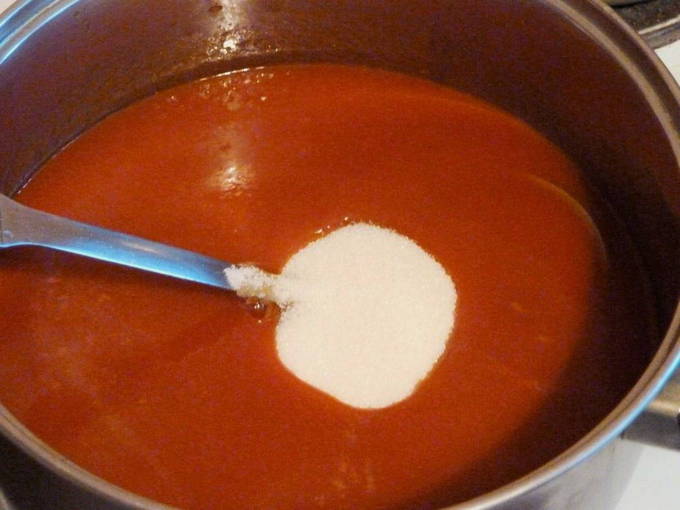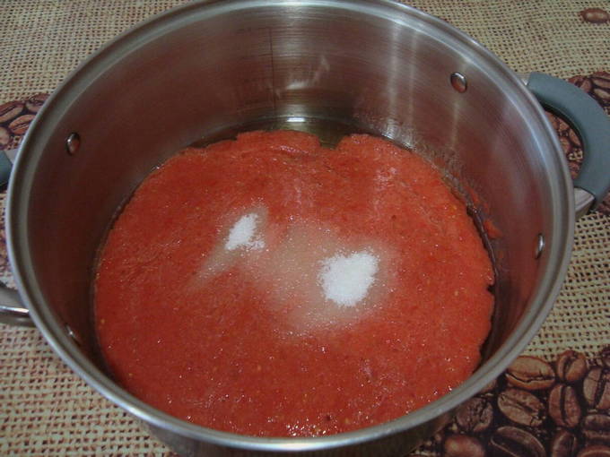- Doe tomatenpuree in een pan op het vuur, voeg suiker en zout toe. Roer het mengsel en breng aan de kook. Kook gedurende 20 minuten.
