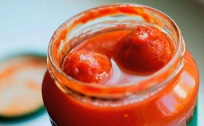 - We zetten de kachel aan. We verwarmen het op een temperatuur van 120 graden.Giet tomaten voor het stapelen in potten (2 kg) met vooraf bereid kokend water. Daarna koelen we ze een paar minuten in water en verwijderen we de huid. Snijd de tomaten in plakjes. We leggen de plakjes tomaat in de potten. Vul ze met tomatenpuree en dek af met deksels.