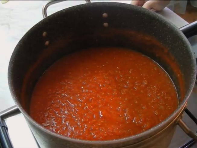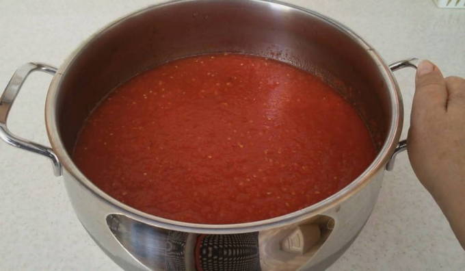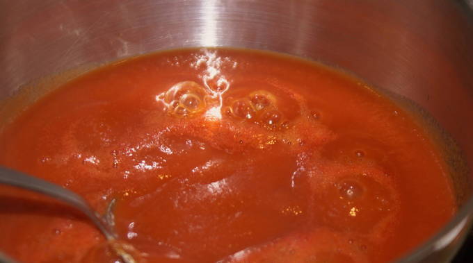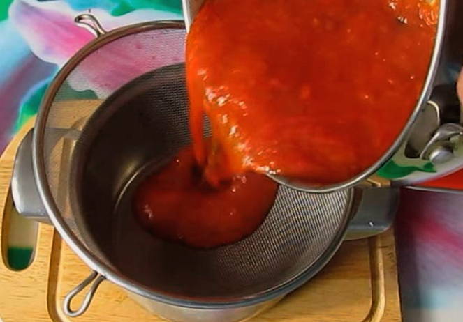 - We filteren de tomatenmassa door een fijne zeef om zaden en schillen te verwijderen. Voeg suiker en zout toe. Wij mixen. Zet het sap op het vuur en breng het op middelhoog vuur aan de kook. We verwijderen het tijdens het kookproces gevormde witte schuim.