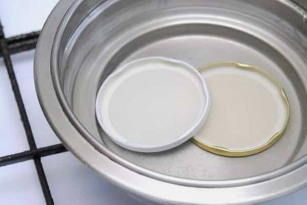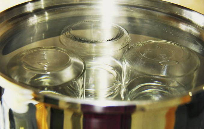 - We controleren de container op naden. Als het niet beschadigd is, steriliseren we de potten en deksels: breng het water aan de kook op het fornuis en doe de deksels erin, kook ze gedurende 10 minuten, was de potten met heet water.