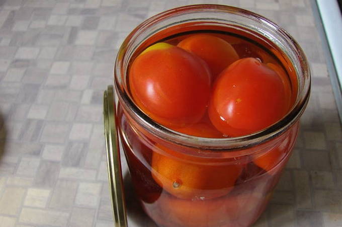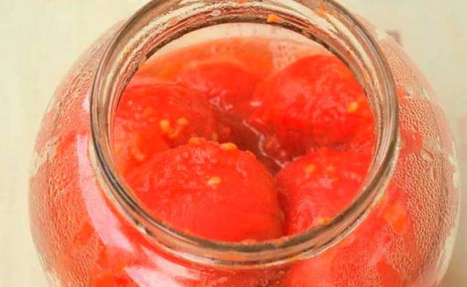 - Doe citroenzuur, zout en suiker op de bodem van een schone pot. We wassen de tomaten en ontdoen ze van de schil: giet een paar minuten kokend water en plaats ze dan gedurende dezelfde tijd in koud water. Tomaten zonder vel doen we in een pot. We dekken de containers af met deksels.