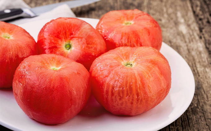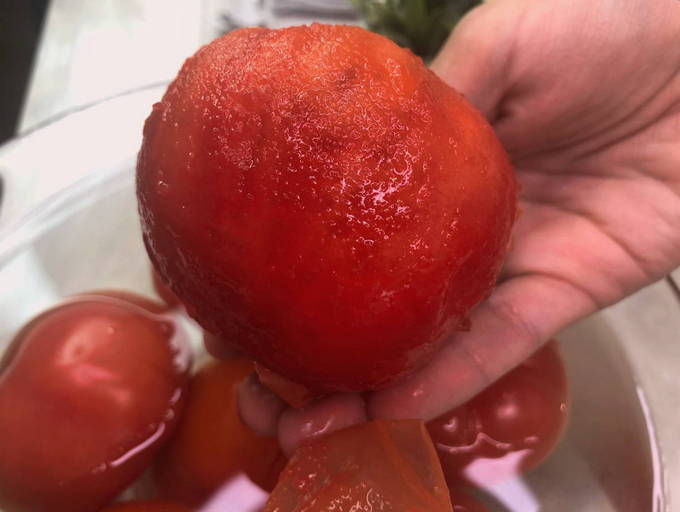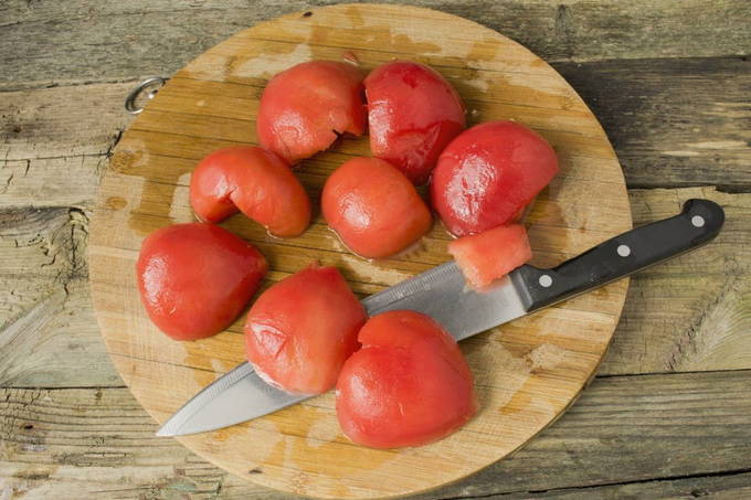 - Laten we nu de dichtere tomaten aanpakken. Breng het water op een gemakkelijke manier aan de kook. Vul de tomaten vervolgens met hete vloeistof. Giet na een paar minuten het kokende water af en vul de tomaten met koud water. Verwijder na een paar minuten de schil van de vrucht.