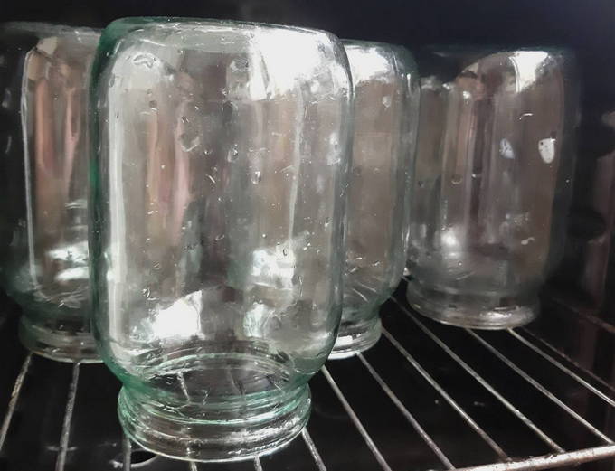 - We steriliseren de potten en deksels: we controleren ze op gebreken, maken ze schoon met soda, spoelen ze grondig af en zetten ze in de oven of magnetron (voeg een beetje water toe aan de pot). Ook kan de container over stoom op het fornuis worden gesteriliseerd.