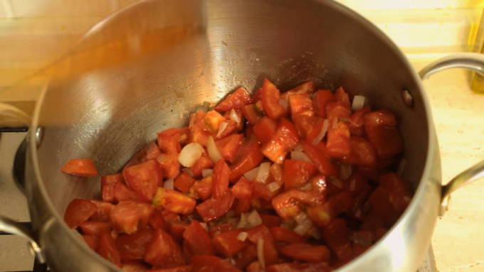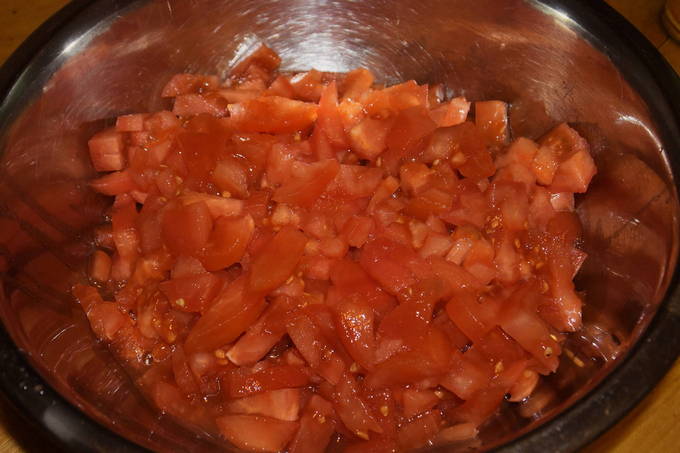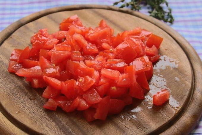 - Vul de tomaten voor de saus met kokend water, van te voren bereid op een gemakkelijke manier. Giet na een paar minuten het hete water weg en vul de tomaten met koud water. Giet na enkele minuten het vocht af en verwijder het vel van de tomaten.