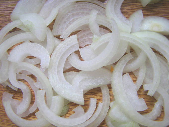 - Schil de ui en spoel hem lichtjes af met water. Daarna snijden we de ui in de lengte in twee delen. Snijd elke helft in halve ringen. We sturen de uien naar de pot met tomaten.
