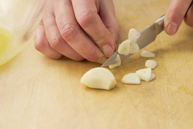 - We maken de potten en deksels schoon met soda. We spoelen ze af met warm water en zetten ze in de oven voor sterilisatie. Scheid het benodigde aantal teentjes van de knoflookbol. We maken ze schoon en snijden ze in plakjes.