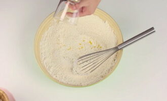 Zeef bloem in een grote kom. Giet de aangegeven hoeveelheid kristalsuiker, zout, gist, vanilline en citroenschil erover. Meng droge ingrediënten met een garde.