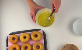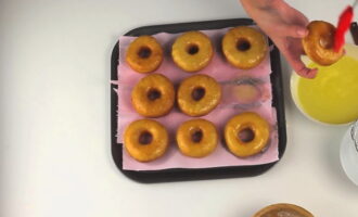 Vet de donuts met het resulterende glazuur aan beide kanten in met een siliconenborstel. We verspreiden ze op een plat oppervlak om af te koelen en het glazuur te fixeren.