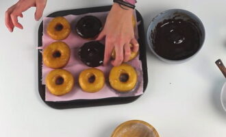 - Verwarm de oven voor op 180 graden en zet de bakplaat met ringen op het middelste niveau. We bakken donuts in twintig tot vijfentwintig minuten goudbruin.