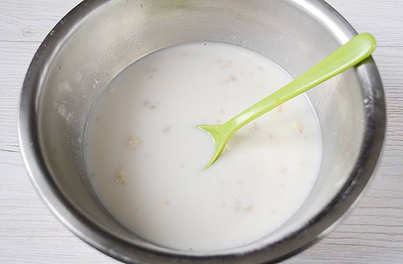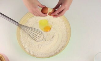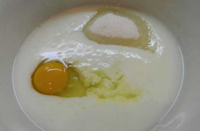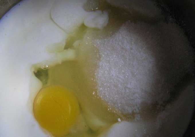 We verwarmen de melk apart tot een temperatuur van vijfendertig tot veertig graden en gieten het in een kom bij het droge mengsel. Voeg vervolgens het ei toe.