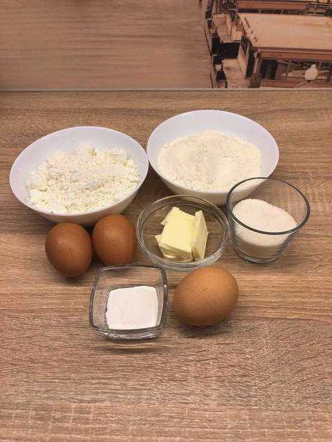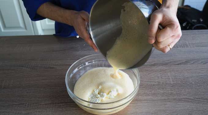 - We breken de eieren in een aparte container. Giet er kristalsuiker en vanillesuiker in. Klop alles samen met een mixer op hoge snelheid tot een weelderig, dik, bijna wit schuim is verkregen. Het opklopproces moet minstens vijf minuten duren. Giet gesmolten boter bij de geraspte kwark en voeg het ei-suikerschuim toe. Meng alles met een spatel door elkaar.