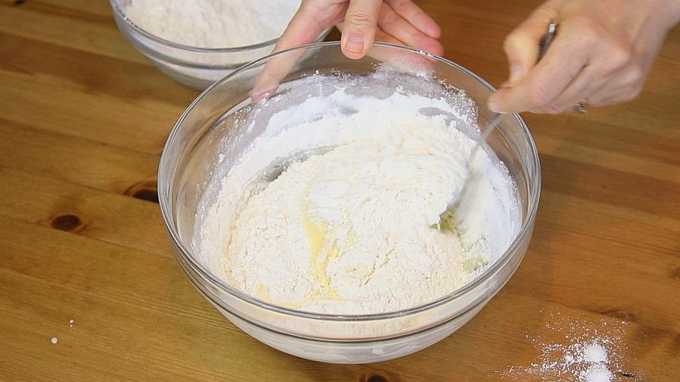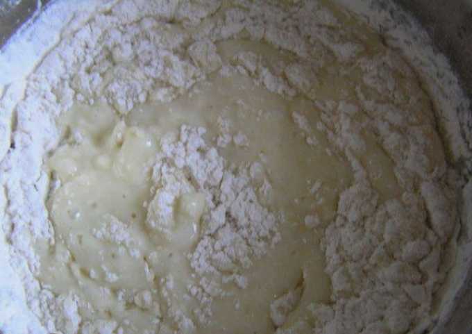 - Giet de gezeefde bloem in kleine porties en kneed goed na elke toevoeging. Afhankelijk van de eigenschappen van een bepaald meel kan het zijn dat je er meer of minder van nodig hebt dan aangegeven in het recept.
