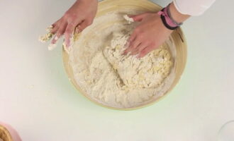 - Kneed het deeg met je handen. Wanneer de massa alle componenten combineert en aan je handen begint te kleven, voeg je de resterende bloem toe. Het afgewerkte deeg moet zacht en volgzaam zijn, niet steil.