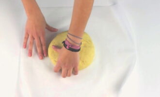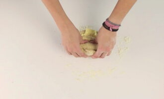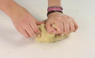 We verspreiden het deeg op het werkoppervlak en kneden het met de hand. Als de massa te veel aan je handen plakt, voeg dan wat meer bloem toe. Kneed een paar minuten tot het deeg niet meer plakt.