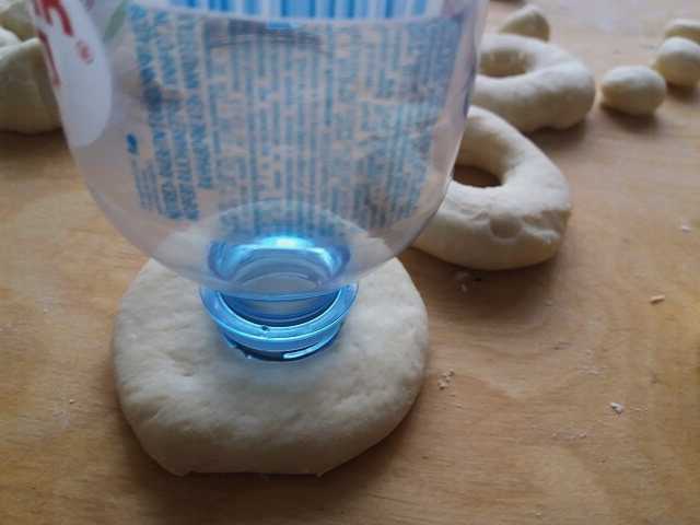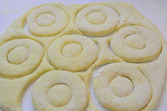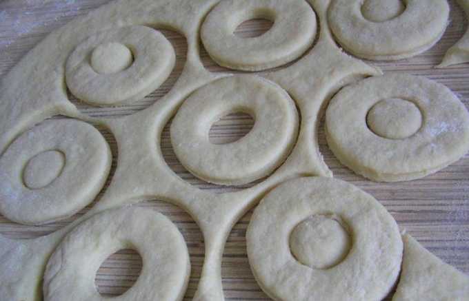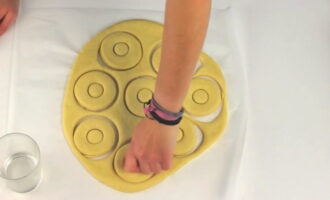 Rol het deeg met een deegroller uit in de laag. De optimale dikte is één centimeter. Knijp de cirkels uit met een ronde snede of gewoon een glas. We maken een gat in het midden van elke cirkel - het is handig om een kleine plastic dop van de fles te gebruiken voor extrusie.