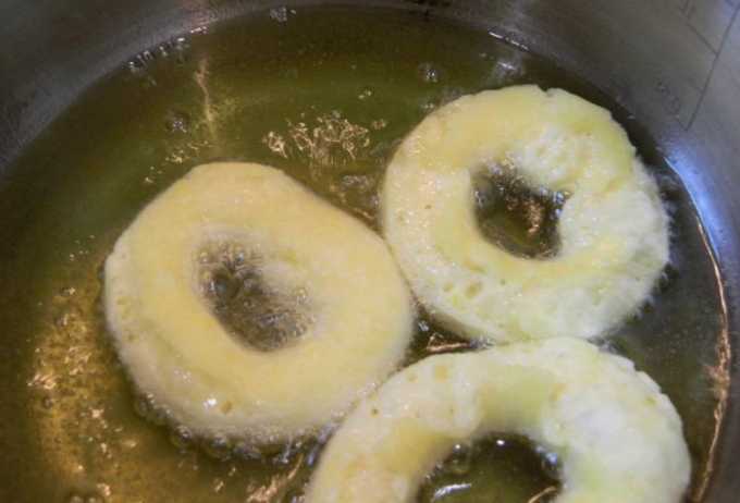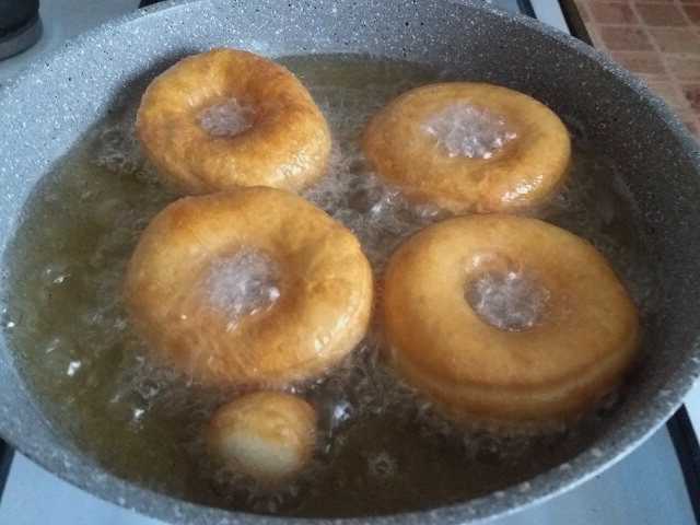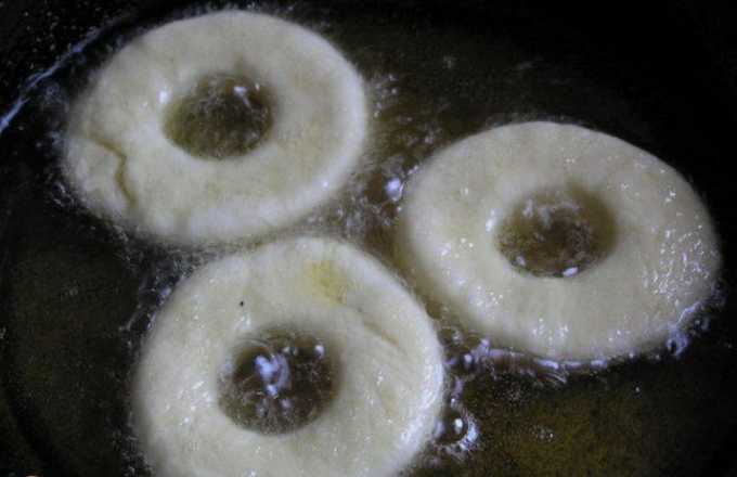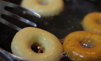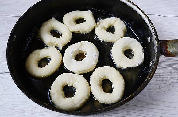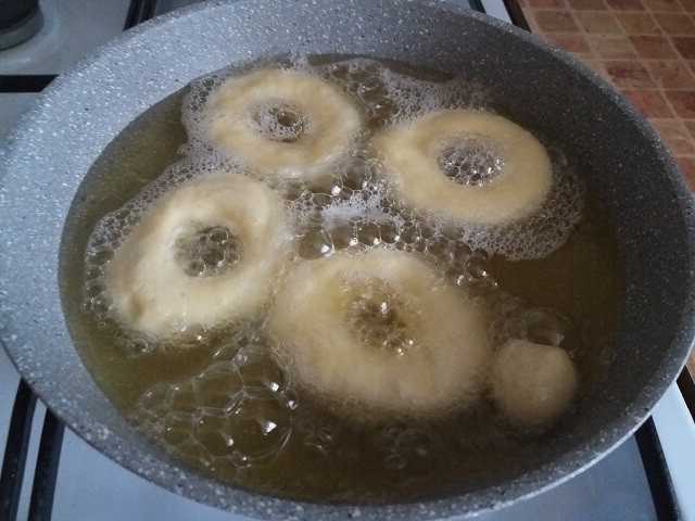 Verwarm in een steelpan of frituurpan de geurloze plantaardige olie in een zodanige hoeveelheid dat deze de bodem bedekt met een laag van twee tot drie centimeter. Leg donuts in hete olie zodat ze vrij liggen en elkaar niet raken. Vergeet niet dat tijdens het frituren de ringen zullen groeien en minstens anderhalf keer in volume toenemen. Bak de donuts aan beide kanten goudbruin.