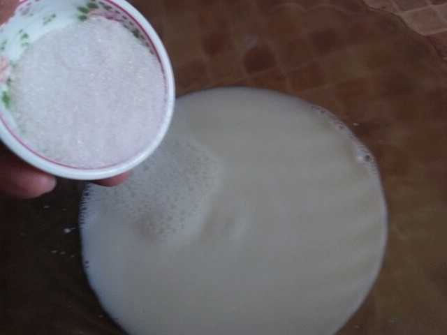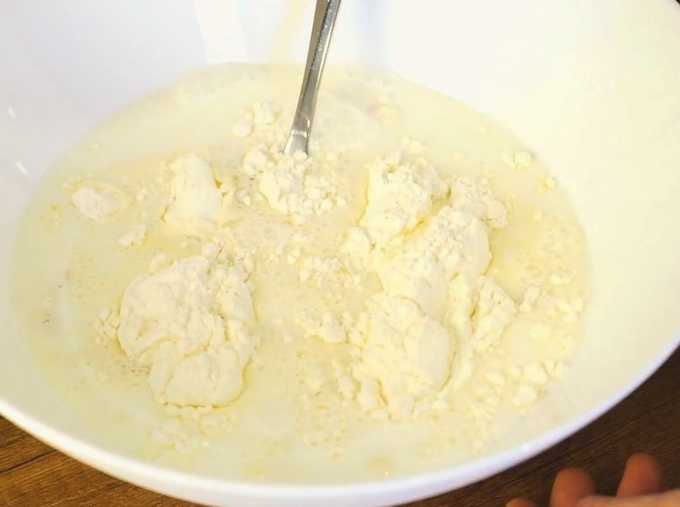 - Giet melk en azijn in het resulterende mengsel. Roer opnieuw tot een gladde massa.