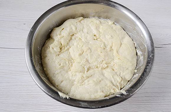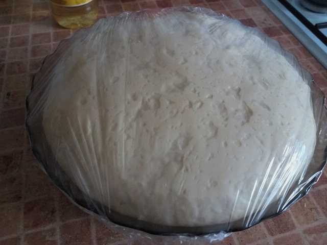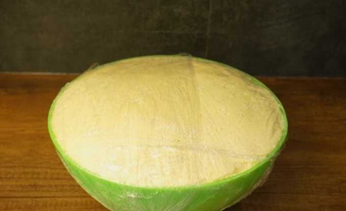 Doe het deeg in een kom en dek af met een schone handdoek. We zetten het op een warme plaats om op te tillen. Na een uur zal de massa ongeveer anderhalf tot twee keer stijgen en poreuzer en zachter worden.