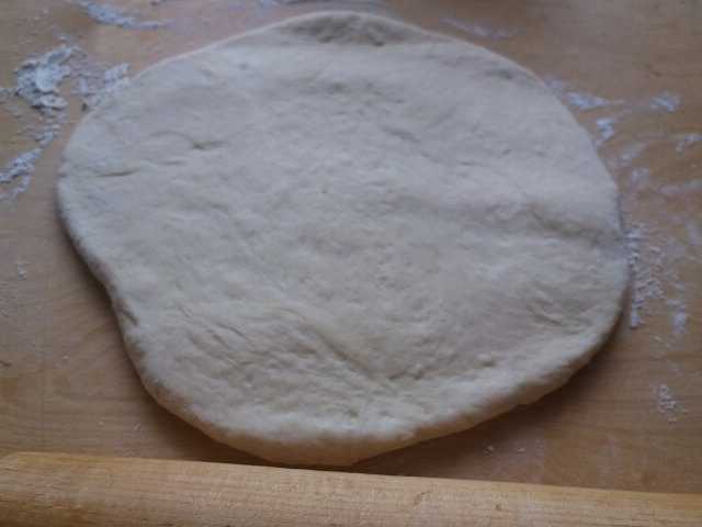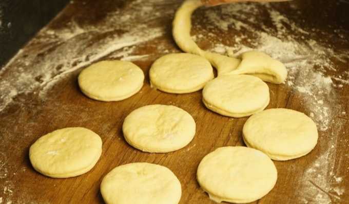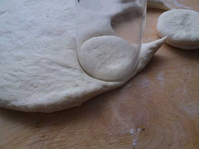 - Haal het deeg na het rijzen uit de kom en leg het op een met bloem bestoven oppervlak. Kneed de massa een beetje zodat deze niet meer plakt. Voor het gebruiksgemak verdelen we het deeg in twee delen. We rollen er een uit in een laag, houden de tweede in een kom onder een deksel - zodat het oppervlak niet uitdroogt. De dikte van de uitgerolde deeglaag is één centimeter. Knip cirkels uit met een speciale vorm of een eenvoudig glas.