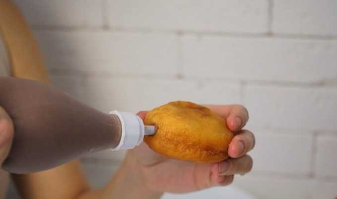 - Laat de gebakken donuts afkoelen en vul ze met de bereide room. Doe hiervoor de room in een spuit met een smal mondstuk. We vullen elke donut door de zijkant van de korst te doorboren met een mondstuk. Als je geen spuit hebt, kun je in elke donut een zijsnede maken en vullen met een theelepel room.