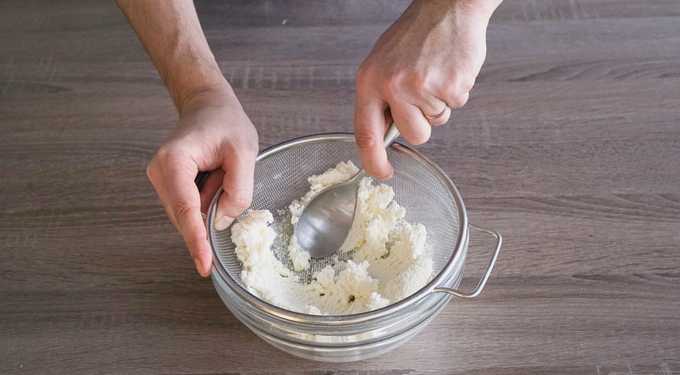 - Om de textuur van de afgewerkte donuts zo zacht en smeltend in de mond te maken, wrijft u de kwark door een fijne zeef. Bovendien slaan we het na het afvegen met een staafmixer - zodat er geen enkele klont overblijft en de massa homogeen is.