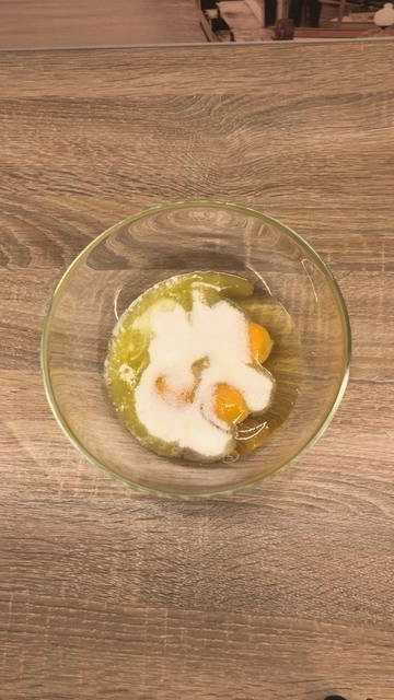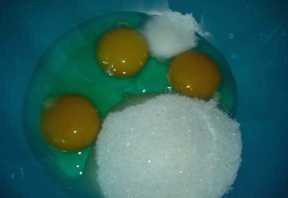 - Breek de eieren in een kom van geschikte grootte, voeg kristalsuiker, zout, bakpoeder en bakpoeder toe. Roer alles met een garde door elkaar tot het volledig homogeen is.