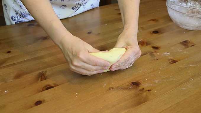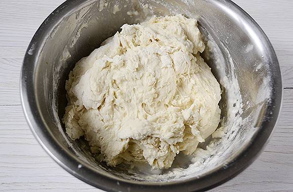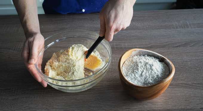 - Voeg bloem toe en kneed het deeg. De consistentie blijkt dik te zijn, balletjes kunnen uit de massa worden gerold en ze behouden hun vorm. Laat het deeg tien minuten op kamertemperatuur staan.