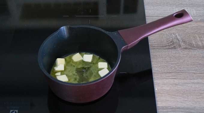 - Snijd de boter in kleine blokjes en smelt deze in een pannetje op het fornuis of in de magnetron tot een vloeibare toestand. Als de gesmolten boter erg heet is, koel hem dan af tot hij warm is.