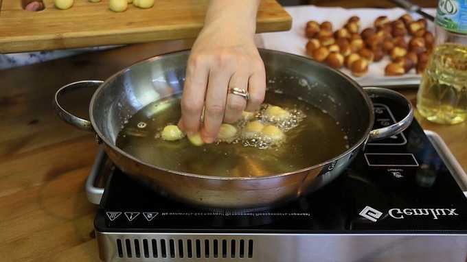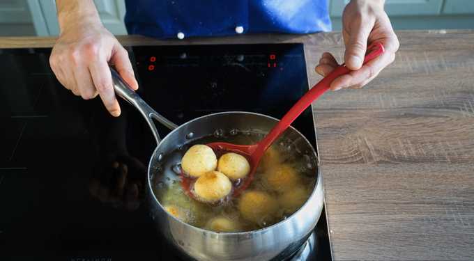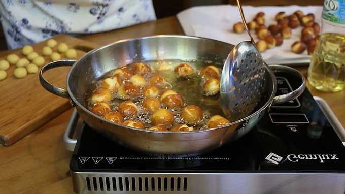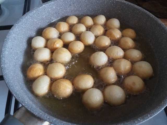 - Verhit een grote hoeveelheid plantaardige olie in een diepe koekenpan of steelpan. Dompel de voorbereide ballen in de kokende olie.