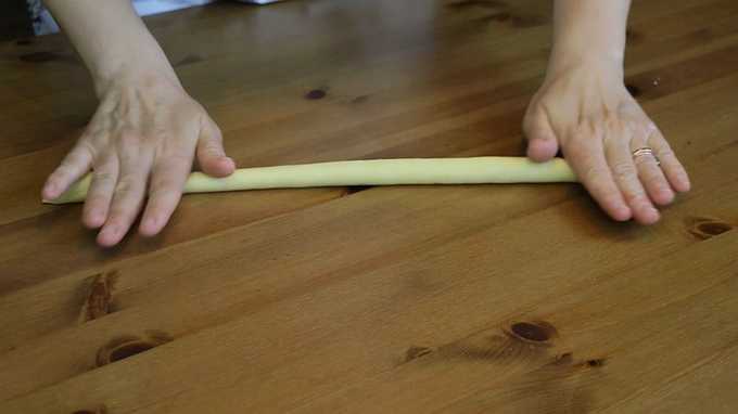 - Bestrooi het werkoppervlak niet met bloem - het moet droog zijn. Als de bloem aan het oppervlak van de donuts blijft kleven, zullen ze gaan branden. We vormen een tourniquet van het deeg en rollen het op de tafel om over de hele lengte dezelfde dikte te krijgen.