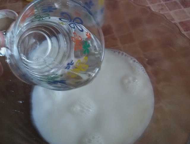- Om het deeg te bereiden, meng je kefir en water in de aangegeven hoeveelheden. We verwarmen het resulterende mengsel op het fornuis of in de magnetron tot het warm is.