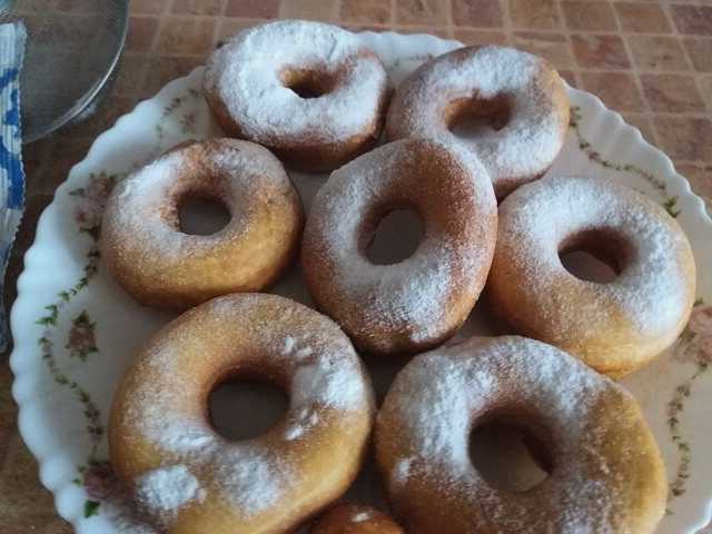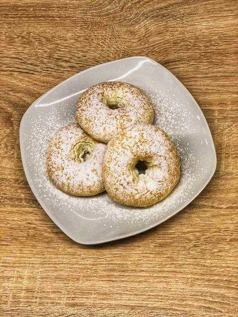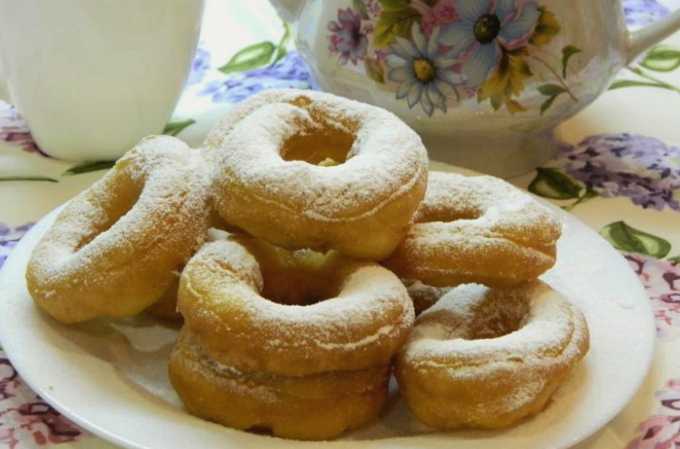 - We halen de afgewerkte donuts uit de oven. We brengen de producten van de bakplaat naar een serveerschaal. Bestrooi de ringen, terwijl ze heet zijn, royaal met poedersuiker door een zeef. Serveer het dessert warm.