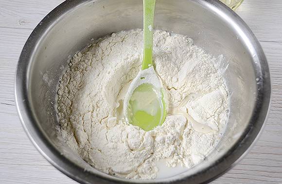 - Giet er twee glazen bloem in en giet er plantaardige olie in.