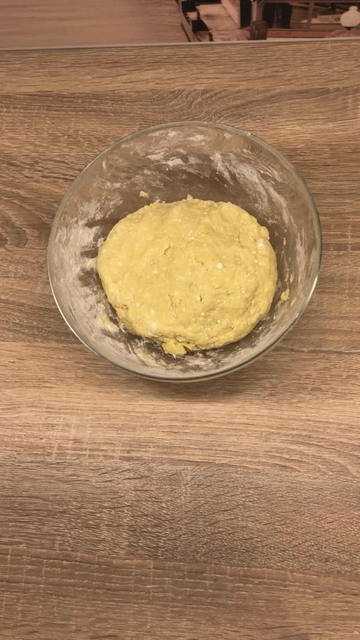 - Zeef de bloem samen met het bakpoeder in een kom. Meng in een aparte kom de gecondenseerde melk, eieren en zout. Roer alles met een garde door elkaar tot het helemaal homogeen is. Giet het voorbereide vloeibare mengsel bij de bloem en kneed het deeg. Eerst werken we met een lepel, daarna met onze handen. De massa blijkt behoorlijk steil te zijn, je kunt het vergelijken met knoedelsdeeg.