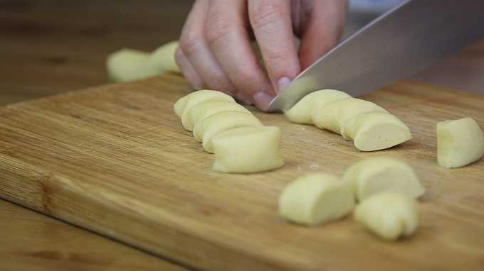 - We snijden de tourniquet in kleine porties met een mes. Rol een bal van elk segment, waarvan de diameter niet meer dan drie centimeter mag zijn. Als donuts te groot worden gevormd, bestaat het risico dat ze niet bakken en van binnen vochtig blijven. We vormen in één keer blanco's van de hele hoeveelheid deeg, omdat donuts vrij snel worden gebakken.