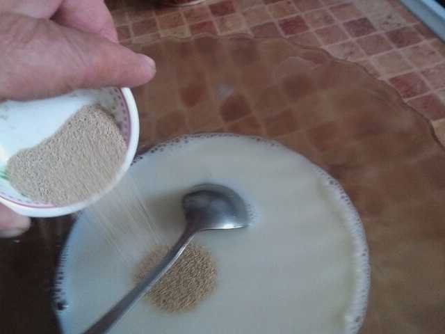 - Voeg droge gist toe en roer tot alle korrels smelten.