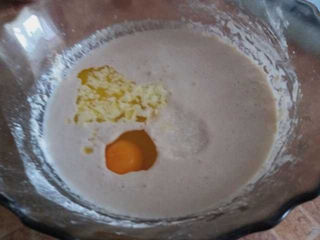 - Breek na de aangegeven tijd het ei in een deeg, voeg zout en boter toe, eerder gesmolten tot een vloeibare toestand. Meng alle componenten met een garde tot een gladde massa.