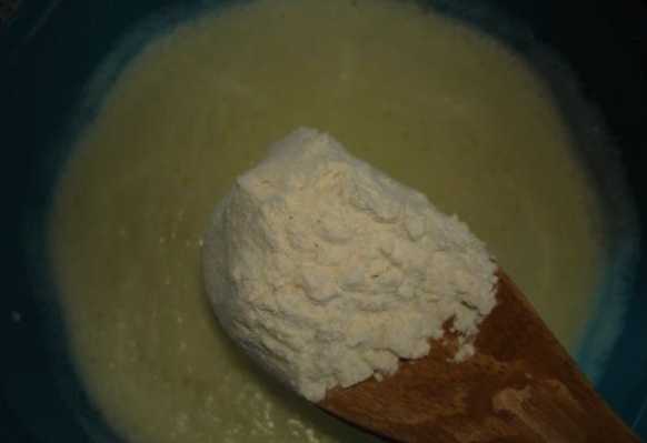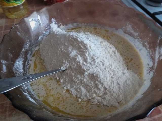 - Zeef een half glas bloem van de totale hoeveelheid bij een vloeibaar mengsel en mix alles met een garde tot een glad beslag. We laten de massa vijftien tot twintig minuten op een warme plaats staan om de gist te activeren. Actief schuim moet op het oppervlak van het deeg verschijnen.