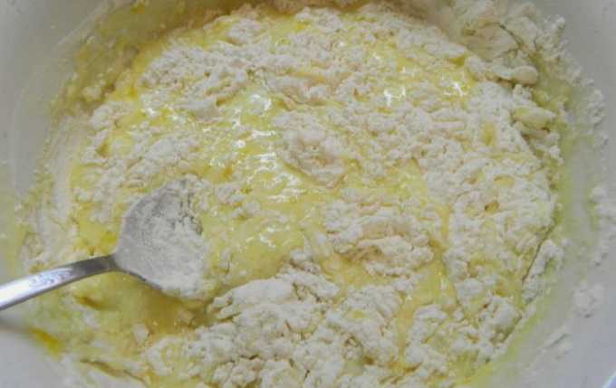We beginnen het deeg te kneden. We werken met een lepel in een cirkel en combineren vloeibare en droge ingrediënten. Daarna gaan we verder met handmatig kneden.