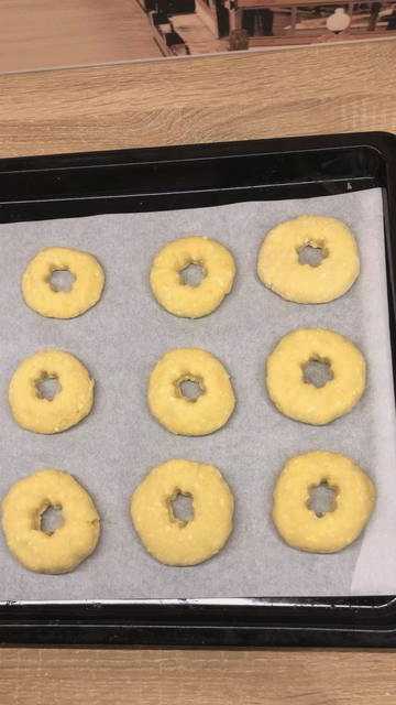 - Rol het resulterende deeg met een deegroller uit op een met bloem bestoven werkvlak. De dikte van het walsen is zeven tot acht millimeter. We snijden cirkels uit met een speciale vorm of een eenvoudig glas. We maken kleinere gaten in het midden. Het is handig om hiervoor een kleine plastic flesdop te gebruiken.