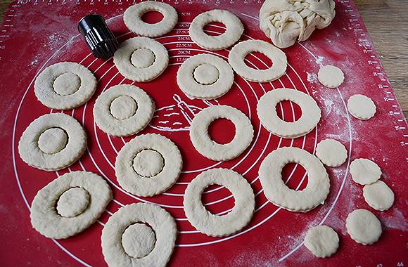 - Bestrooi het werkblad met een dun laagje bloem en rol het deeg daarop uit tot een laag van een centimeter dik. Knip cirkels uit in een ronde vorm. Snijd in het midden een cirkel met een kleinere diameter. Het is handig om hiervoor een kleine plastic flesdop te gebruiken.