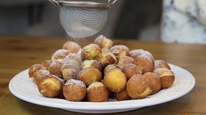 - Haal de gebakken beschuitbollen uit de pan en leg ze meteen op keukenpapier zodat het overtollig vet wordt opgenomen. Je kunt een van de donuts meteen breken om de kruimels op donuts te controleren en om ervoor te zorgen dat de temperatuur van de oven en de bruiningstijd correct zijn. Als de kruimel niet gebakken is, moet de temperatuur van de kachel worden verlaagd en moet de braadtijd worden verlengd. Leg de gedroogde donuts op een serveerschaal en bestrooi ze rijkelijk met poedersuiker.