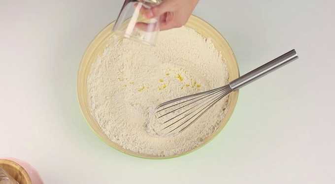 Zeef bloem in een grote kom. Giet de aangegeven hoeveelheid kristalsuiker, zout, gist, vanilline en citroenschil erover. Meng droge ingrediënten met een garde.
